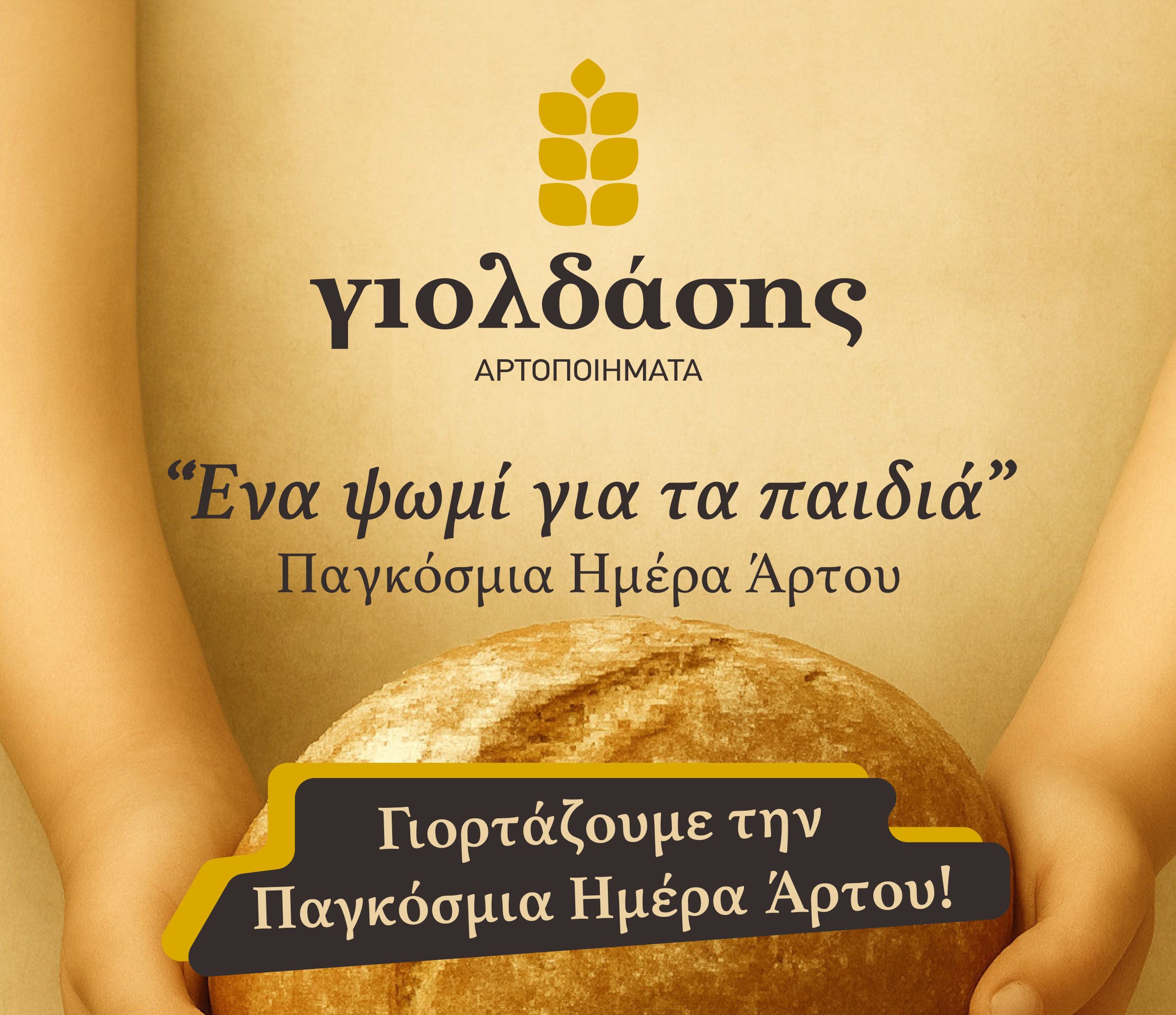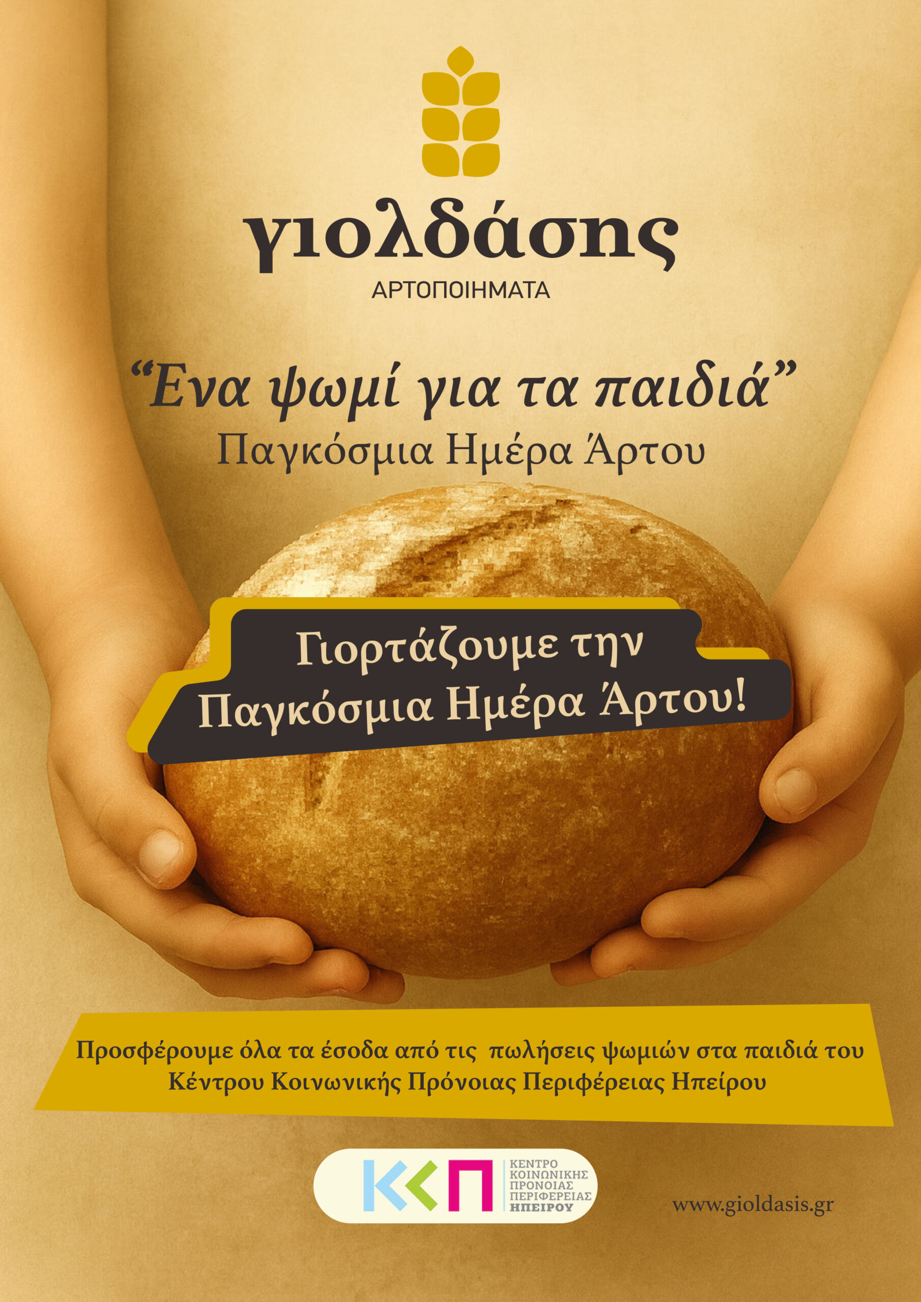 Η αλυσίδα φούρνων Γιολδάσης Aρτοποιήματα γιορτάζει αύριο την Παγκόσμια Ημέρα Άρτου με μια κοινωνική προσφορά. Όλα τα έσοδα από τις πωλήσεις των ψωμιών στα δώδεκα καταστήματα του δικτύου θα δοθούν για την ενίσχυση των παιδιών στο Κέντρο Κοινωνικής Πρόνοιας Περιφέρειας Ηπείρου (ΚΚΚΠΗ). Το Κέντρο, εκτός των άλλων, περιλαμβάνει τέσσερις μονάδες για παιδιά και έφηβους (Ιωάννινα, Φιλιατά, Κόνιτσα και Πωγωνιανή). Κύριος στόχος τους είναι η παροχή στέγασης, σίτισης, μόρφωσης, ιατροφαρμακευτικής περίθαλψης, κ.ά. παιδιών και των δυο φύλων που στερούνται κατάλληλου οικογενειακού περιβάλλοντος και έχουν ανάγκη ιδρυματικής προστασίας.