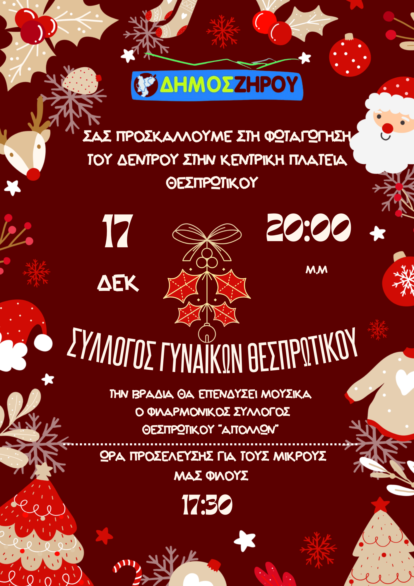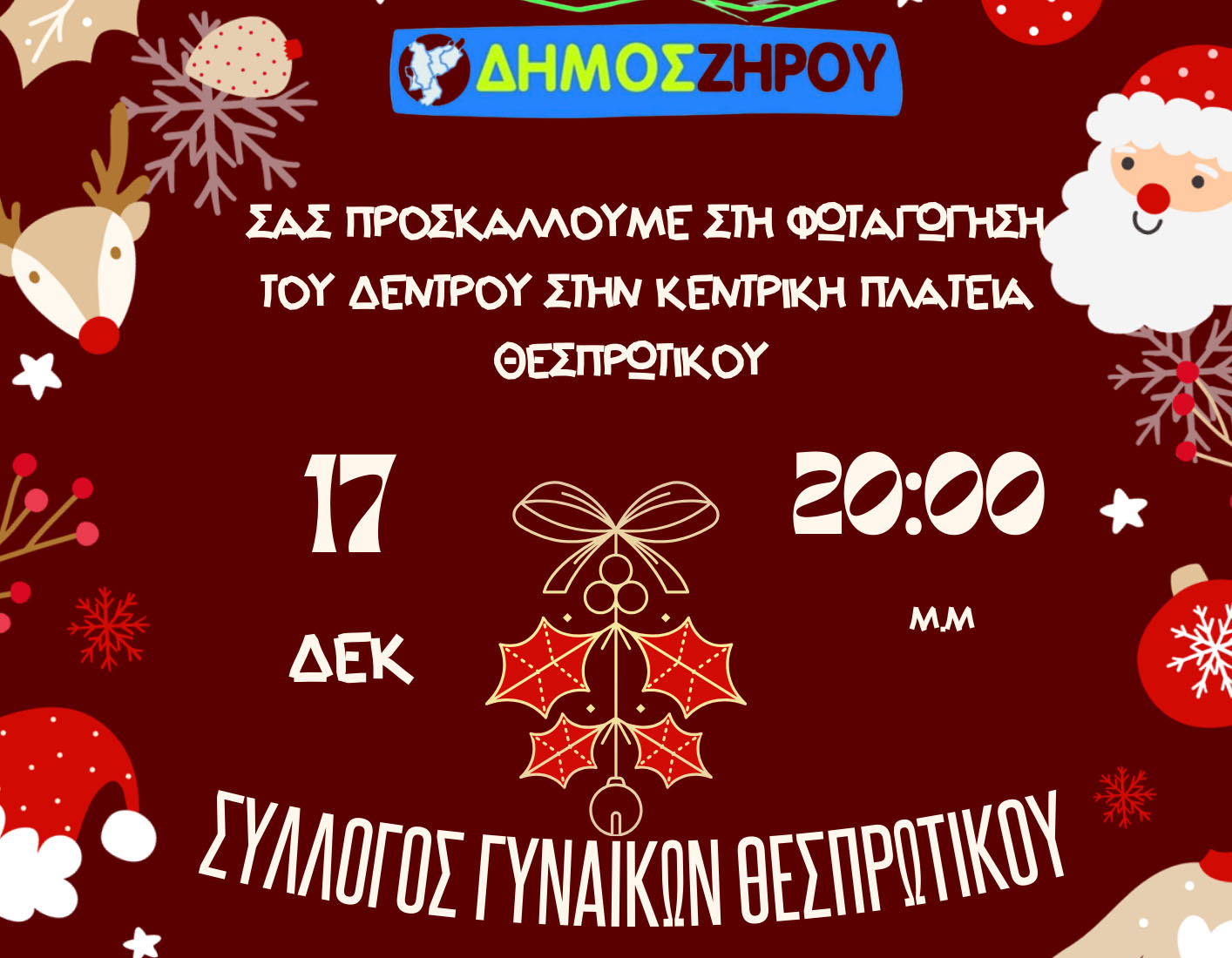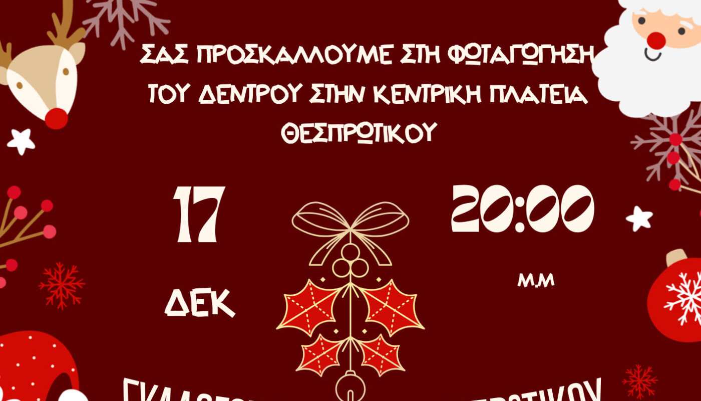 Ο Δήμος Ζηρού μετά του Συλλόγου Γυναικών Θεσπρωτικού σας προσκαλούν την Τετάρτη, 17 Δεκέμβρη & ώρα 8 μ.μ., στη φωταγώγηση του Χριστουγεννιάτικου Δέντρου στην Κεντρική Πλατεία του Θεσπρωτικού ! Τη βραδιά θα επενδύσει μουσικά ο Φιλαρμονικός Σύλλογος Θεσπρωτικού “Απόλλων”.
